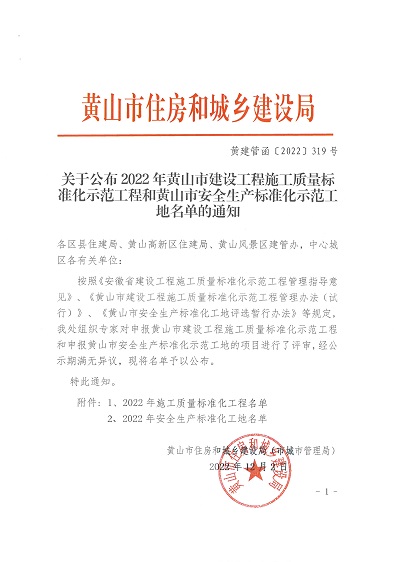 黃山市建工集團(tuán)股份有限公司承建的徽州家園項(xiàng)目、歙縣人民醫(yī)院醫(yī)療能力提升項(xiàng)目、黃山橫江灣凱悅酒店項(xiàng)目、高鐵黟縣東站站前廣場(chǎng)及附屬配套工程、黃山市南部城鎮(zhèn)群水務(wù)調(diào)度中心項(xiàng)目、黃山北海路公交綜合大樓工程榮獲2022年施工質(zhì)量標(biāo)準(zhǔn)化工程和安全生產(chǎn)標(biāo)準(zhǔn)化工地的殊榮。