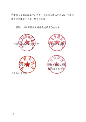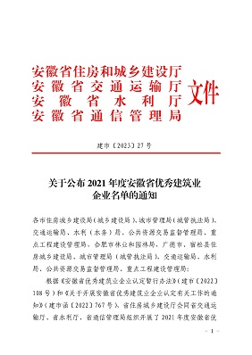 根據(jù)《安徽省優(yōu)秀建筑業(yè)企業(yè)認(rèn)定暫行辦法》和《關(guān)于開展安徽省優(yōu)秀建筑業(yè)企業(yè)認(rèn)定有關(guān)工作的通知》。省住房城鄉(xiāng)建設(shè)廳會同省交通運(yùn)輸廳、省水利廳、省通信管理局組織開展了2021年度安徽省優(yōu)秀建筑企業(yè)認(rèn)定工作。