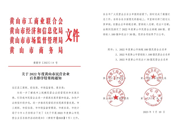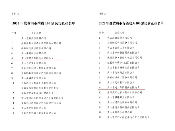 日前,由黃山市工商聯(lián)、市經(jīng)信局、市監(jiān)管局及市商務(wù)局聯(lián)合發(fā)布2022年度黃山市民營企業(yè)納稅及營銷收入百強名單公布,黃山建工集團(tuán)連續(xù)多年再次實力入圍,獲此殊榮!