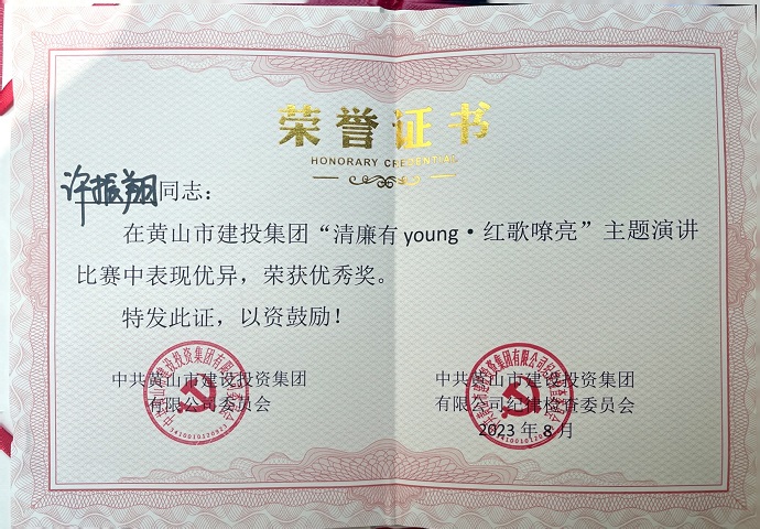為慶祝中國共產(chǎn)黨成立102周年,深入推動學(xué)習(xí)貫徹習(xí)近平新時代中國特色社會主義思想主題教育,全面貫徹落實黨的二十大精神,8月18日,由黃山建投集團(tuán)舉辦的“清廉有young·紅歌嘹亮”主題思政課隆重舉行,參賽選手以生動的語言、動聽的歌聲、真摯的感情為大家?guī)硪粓鰟e開生面的視聽盛宴,黃山建工集團(tuán)青年員工許振翔在思政課演講比賽中取得優(yōu)勝獎。