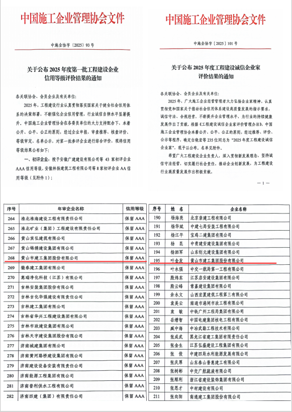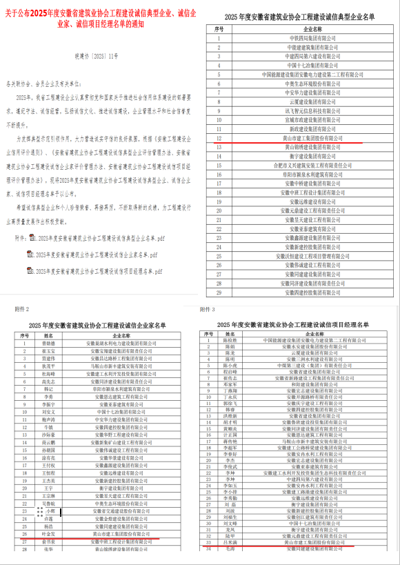近日,國家及省級行業(yè)協(xié)會相繼公布關(guān)于2025年度工程建設(shè)領(lǐng)域系列信用評價與先進(jìn)評選的結(jié)果,黃山市建工集團(tuán)股份有限公司憑借卓越的綜合實(shí)力、良好的市場信譽(yù)和穩(wěn)健的經(jīng)營表現(xiàn),在多個權(quán)威評選中脫穎而出,收獲累累碩果,再次彰顯了公司在行業(yè)內(nèi)的領(lǐng)先地位與誠信標(biāo)桿形象。